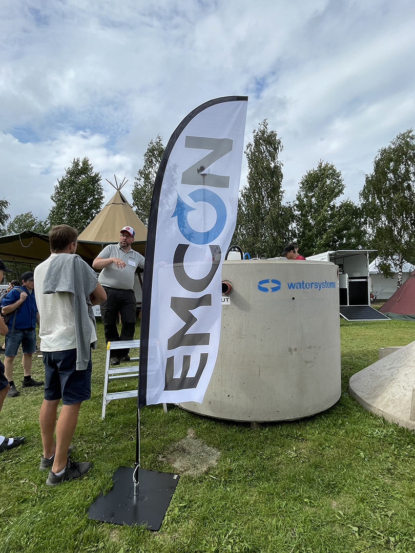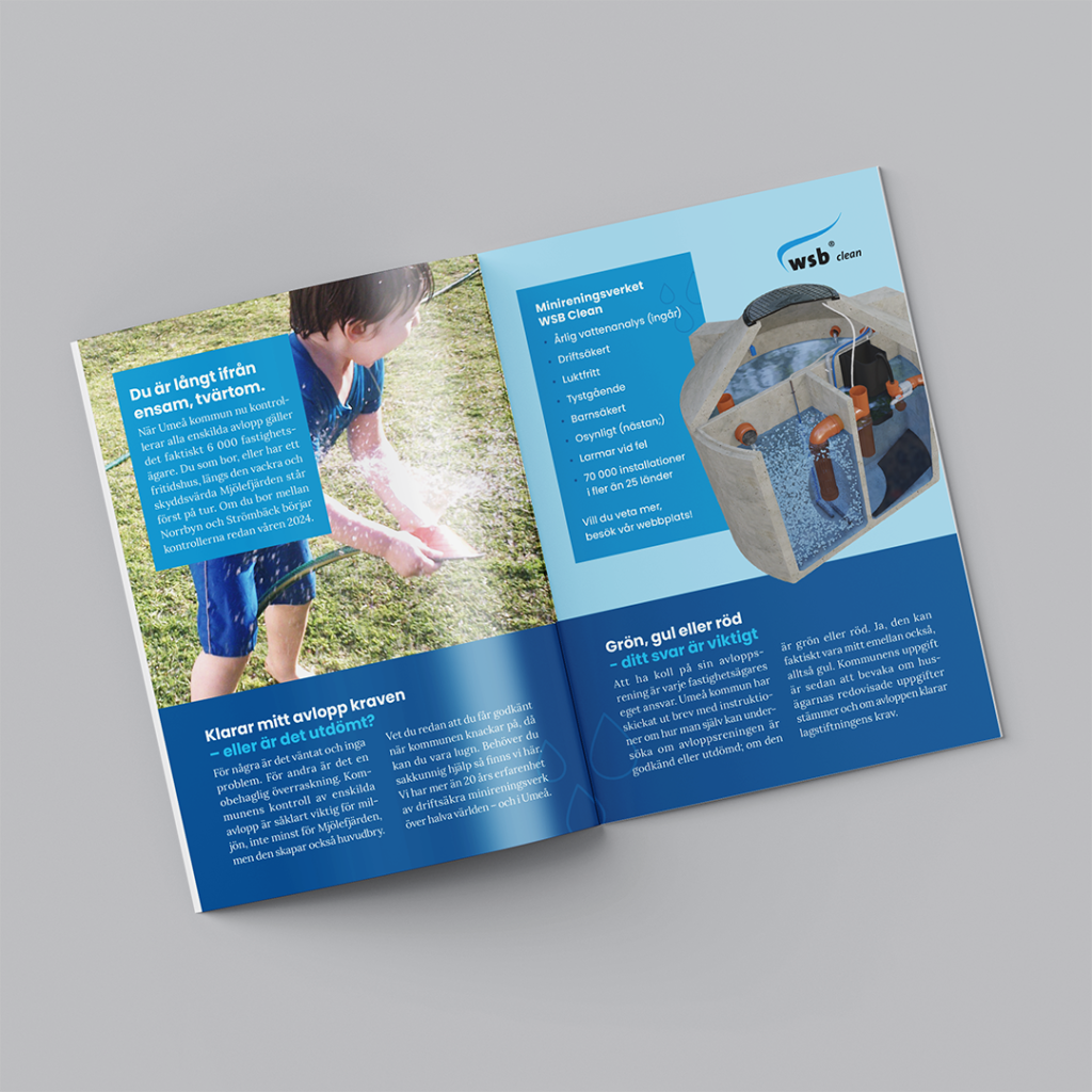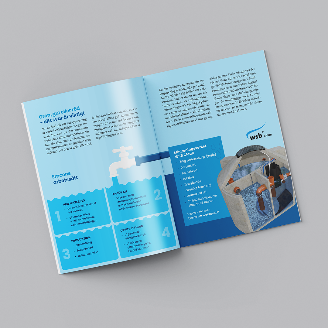 Kunden återkom senare inför en mässa och ville att jag tog fram liknande broschyrer, men med mer generellt riktad text och få med sin arbetsprocess. De fick även hjälp med att placera ut sin logga på monterbord samt beachflaggor.